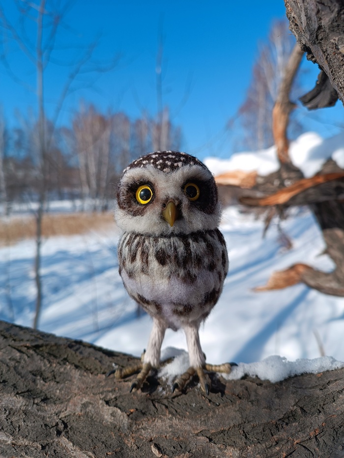 Сова выполнена из овечьей шерсти с использованием множества дополнительных материалов: глаза - стекло с авторской росписью, маховые перья - грунтованный текстиль с ручной росписью, ноги подвижны, имеют проволочный стальной каркас внутри, голени обшиты мягчайшим плюшем, вышивка дополняет красочность оперения на голове и спинке, голова на поворотном шплинте.