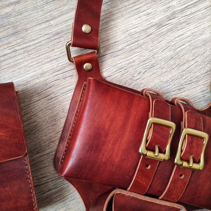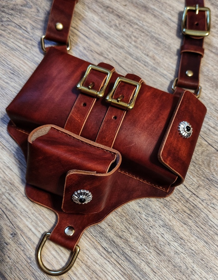 Привет пикабушники. Сделали портупею для молодого человека. Предназначена для хранения телефонов, кошелька и наушников. Кожа краст, вручную окрашивали, после тонировали и закрывали составом на основе воска. Фурнитура латунь. Кончо из непонятного металла. Процесс был трудоемким в плане большого количества урезов.