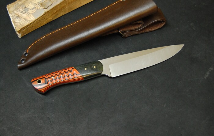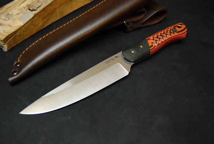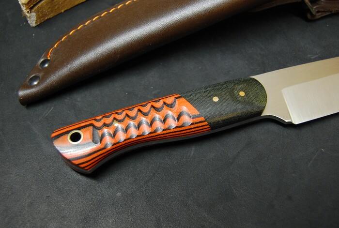 Нож изготовлен из нержавеющей AUS10co, 3 мм толщиной. Голомень и рикассо клинка в продольном сатине. Конструкция фултанг. Спуски прямые, чуть больше половины клинка. Рукоять двухсоставная из микарты. На черно-оранжевой части добавлена фактура битого камня. Пины латунные 3 мм. Темлячное отверстие в в виде латунной трубочки 8 мм