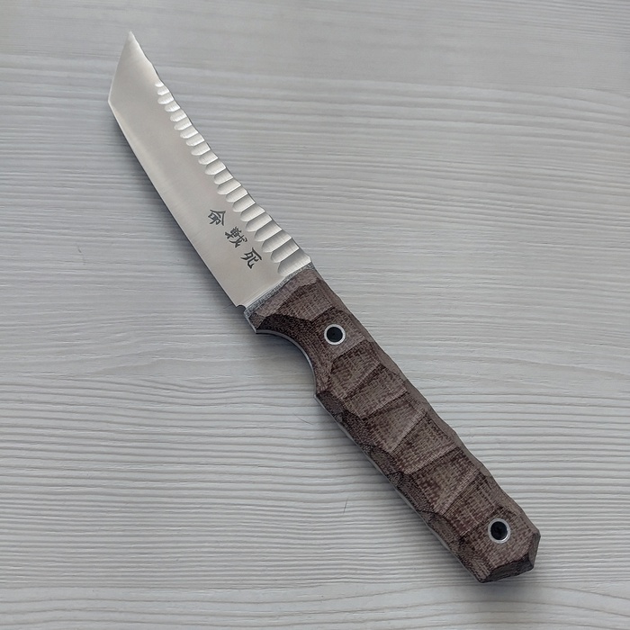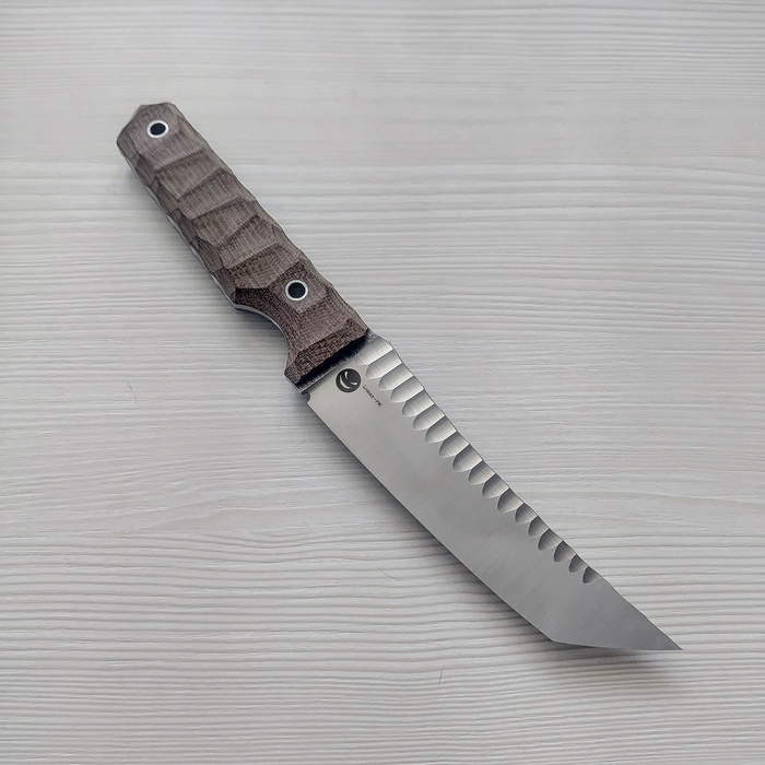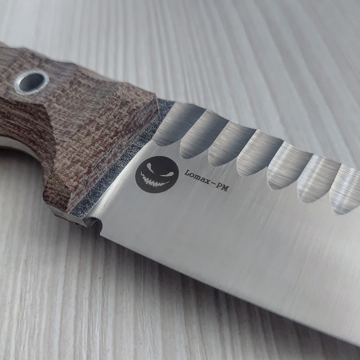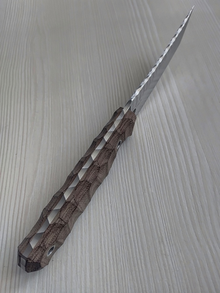 Но в процессе заказа железяк и ожидания акценты сместились с Каспия сильно дальше на восток, аж до Страны Восходящего Солнца, и вот что по итогу вышло- гибрид танто и каспийского пчака. От пчака линии спинки и обуха и глубокая подпальцевая выемка, а от танто спрямленная рукоять и линия РК. Вышло, как по мне, драйвово и агрессивно. По материалам: сталь от Lohmann Lomax(LO-PM) в ТО Сергея Бурова и текстолит. Сейчас нож уехал одеваться у отличного мастера, если свезет получить фото, выложу отдельный пост с мегакрутыми ножнами. На моих фото клинок и готовый нож.