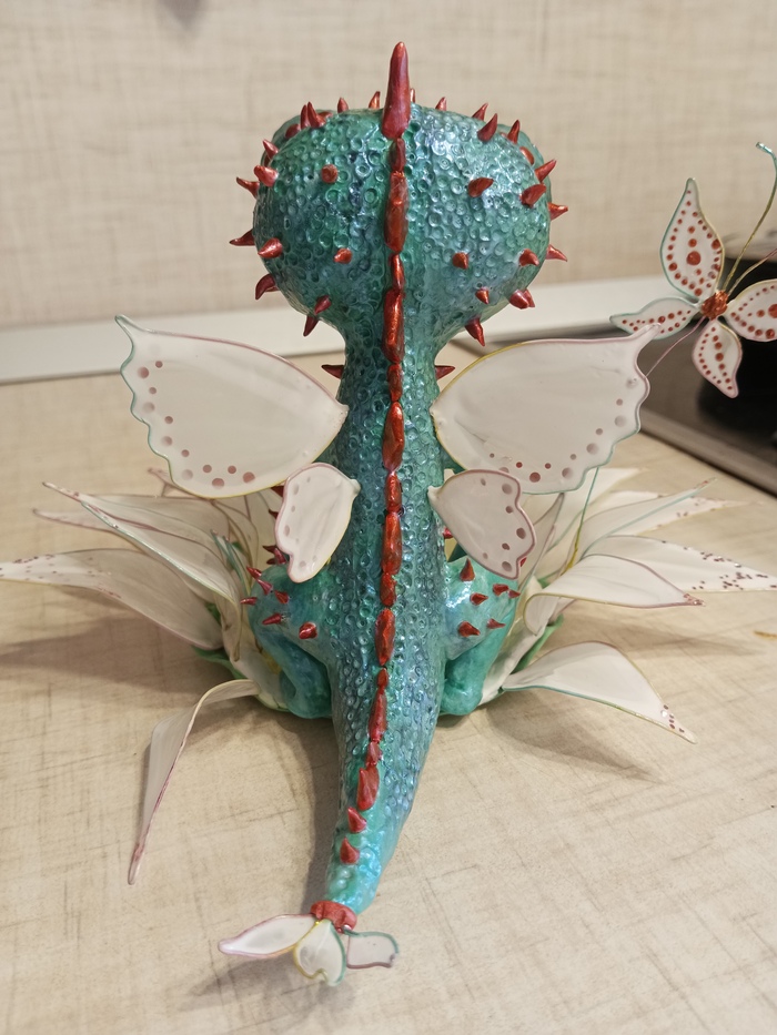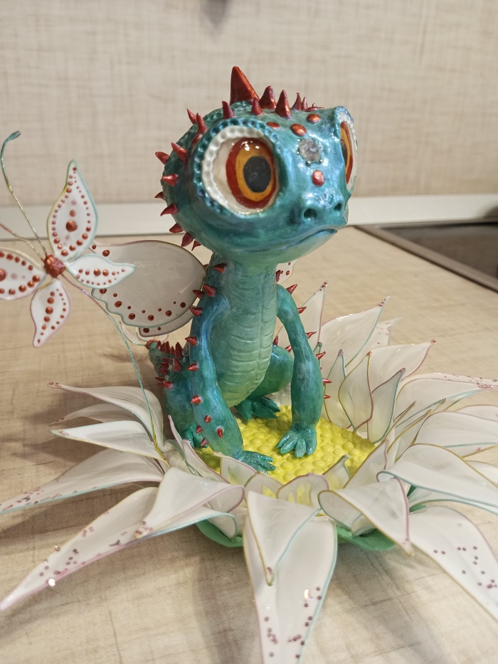 Опоздала я к новому году, даже на китайский новый год, со своим драконом.Вот такой чудик слепился, в цветок можно складывать всякую ерунду, колечки-сережки например.