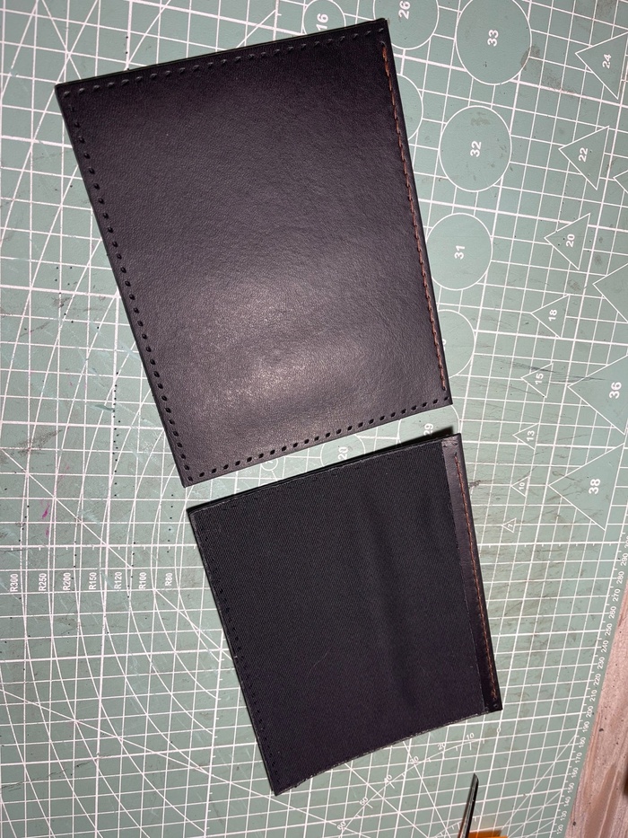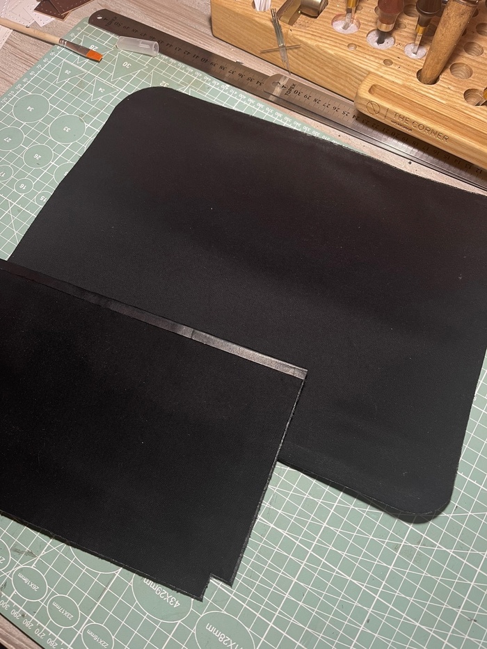 Следующим этапом я приклеил ко всем необходимым деталям подклад. Здесь тоже ничего особенного, просто вырезал ткань по форме деталей, минус пару мм , промазал клеем ткань и кожу по периметру и аккуратно соединил вместе, простучал периметр. Клей использовал SAR 306, но в последствии понял, что даже Ecosar отлично бы справился с данным типом ткани, учитывая что она всё равно прошивается в итоге.