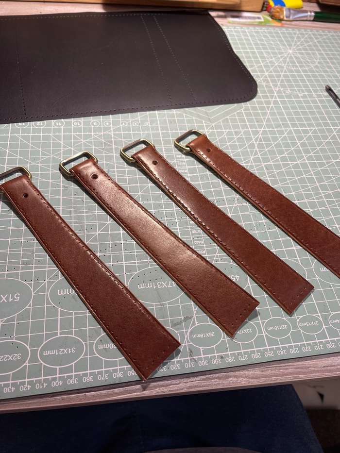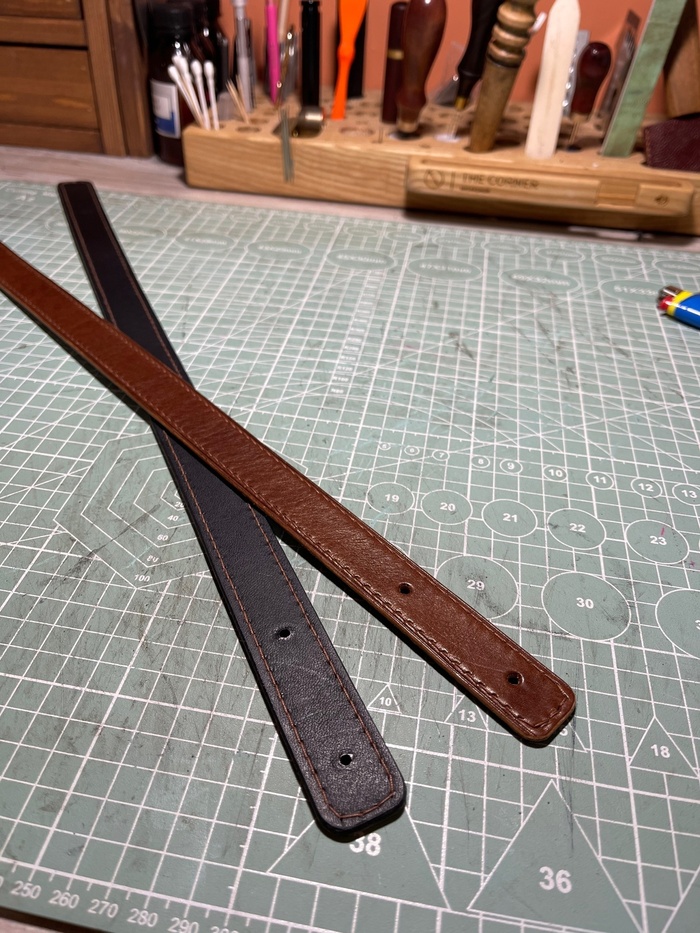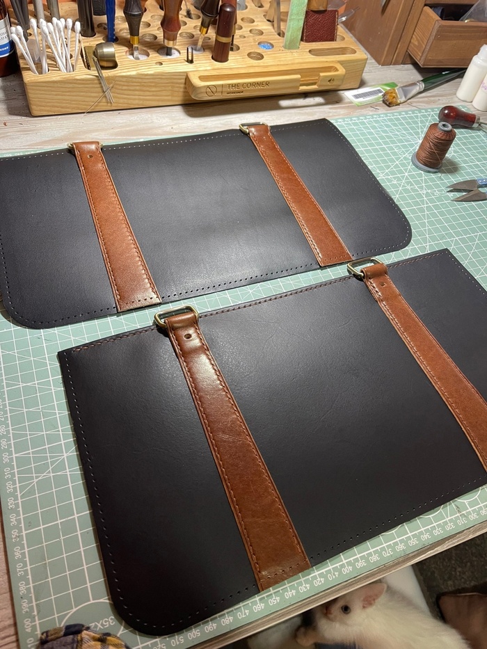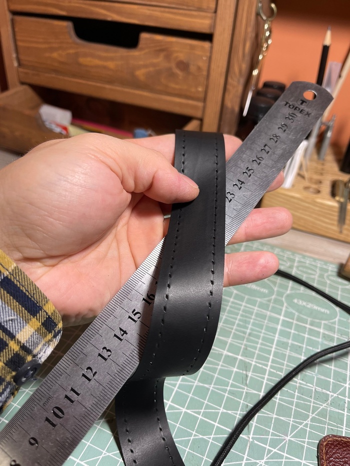 На всех накроенных деталях чёрного цвета обязательно утоньшил края, для того чтобы итоговое изделие держало правильную форму и для подворотов на краях где это требовалось. От того на сколько будет равномерным утоньшение зависит и финальный результат.
