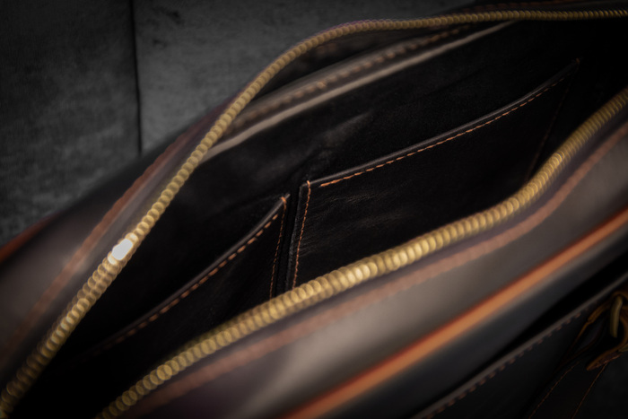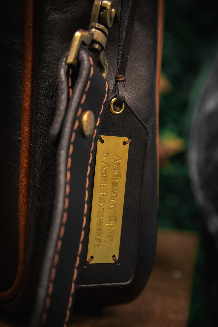 На внутренние части основным стенок пришил карманы и латунный шильдик с гравировкой (это просьба заказчика, там пасхалка для того, кому предназначался подарок)