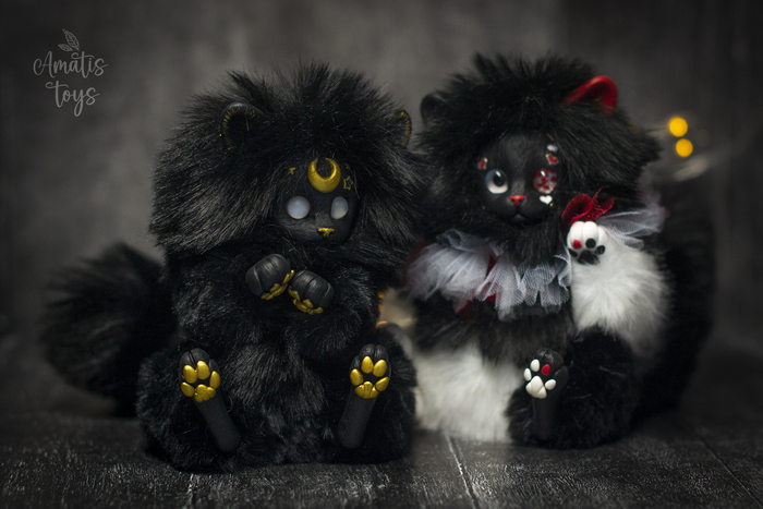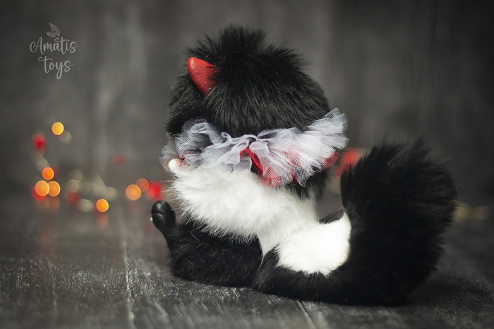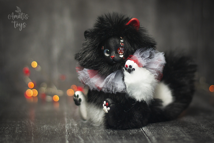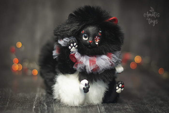 Котёнок Арлекин, в стилистике карточного джокера и с уклоном в червовую масть. Арлекин и Джокер, кстати, по факту один и тот же архетип, просто в разных проявлениях - никогда об этом не задумывалась, осознала уже в процессе. Несмотря на свою трикстерскую природу, коть оказался крайне ласковым и покладистым: с некоторыми зверями такое бывает - то одни и те же детали по 10 раз переделывать придется, то весь исколешься, изрежешься в процессе привычного уже действия, то еще какая-то ерунда случится. А этот просто лапушка: "- Нет задуманного принта для глаза? Ничего, мне такой блестящий тоже хорошо подойдет. Роспись с плоского эскиза не ляжет на объемную мордочку? Попробуй асимметричную полоску сердец, будет смотреться даже круче!" И так во всем, очень приятно было с ним работать.
