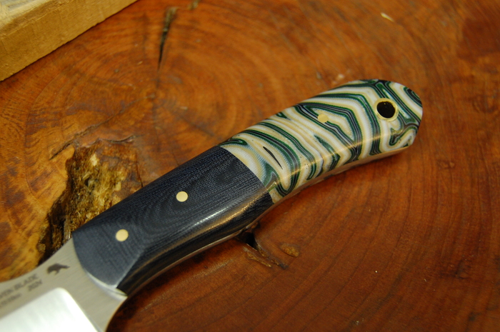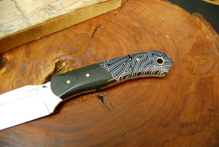 Нож получился с дефектом. При монтаже сместились плашки и на стыке видно неровность. Жаль, нож получился красивым. Микарта чем то похожа на топографическую карту. Разбирать не стал, оставил как есть