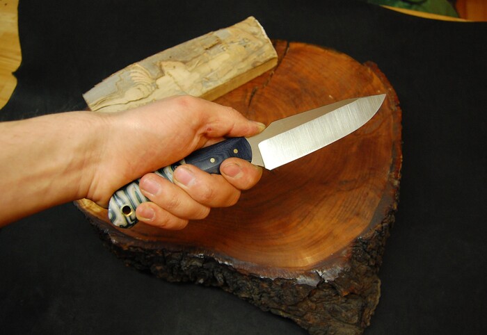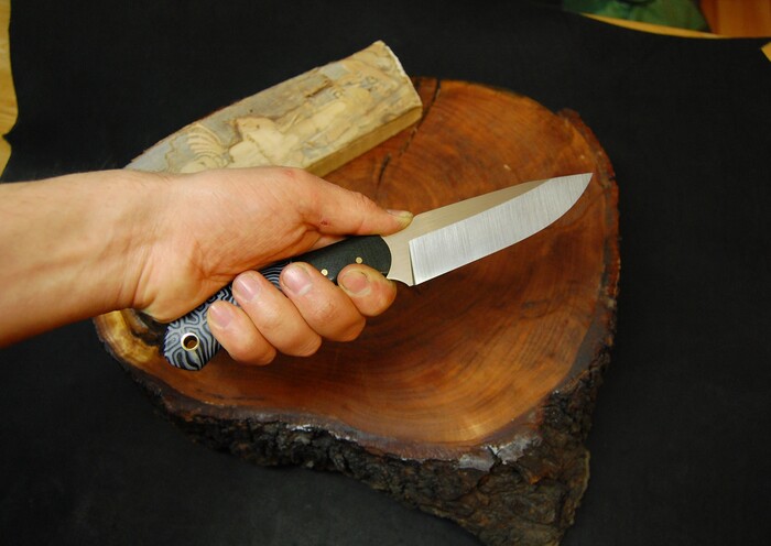 Первым сделал этот нож. По форме среднего размера. Выборка у обуха для большого пальца. Как правильно называется этот хват я не знаю, то пистолетный, то фехтовальный, то диагональный, то филиппинский то еще какой то. Знающий человек наверное поправит меня в комментариях)