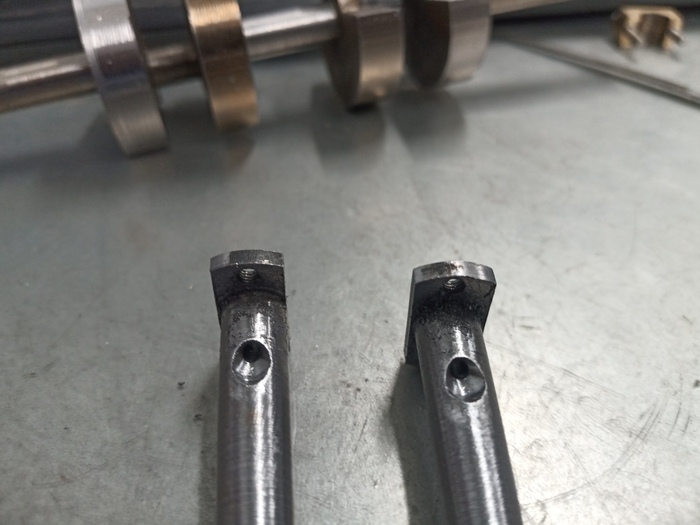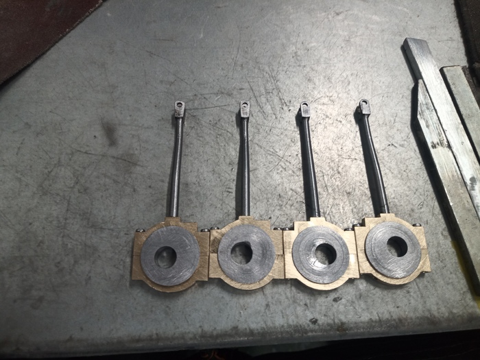 Взялся за шатуны. Штоки окончательно отшлифовал, снял все фаски и облой с них и других деталей, а так же выставил и затянул их в полукольцах, применив красный фиксатор резьбы. В шатунах цилиндров просверлил каналы для смазки и обработал торцевые поверхности подшипников скольжения.