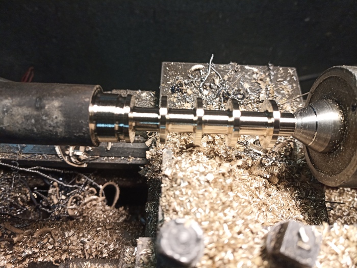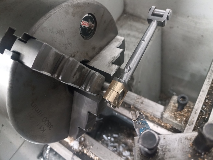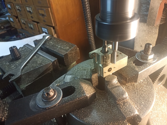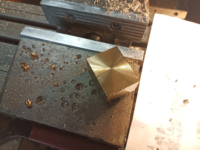 Материал корпуса регулятора латунь, золотник- сталь 40х. Корпус изготовлен из кругляка методом оквадрачивания с переводом половины болванки в стружку, как обычно. Зазор между золотником и корпусом получился таким, что при его установке оставшийся внутри воздух не выходит и пружинит. Думаю, должен закрывать поток пара плотно.