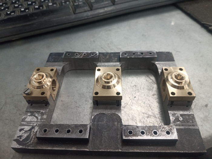Когда наружные поверхности были готовы, можно было сверлить отверстия. Каналы для кранов пришлось делать сложной формы, сделав сначала глухие отверстия, к которым просверлить отверстия меньшего диаметра, выходящие в профрезерованные в плоскости канавки. Краны заняли свое место.