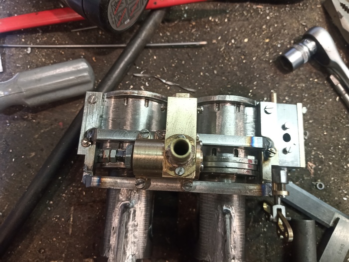 Теперь, когда регулятор готов, нужно думать, как его установить и подключить. Здесь то я решил попробовать высокотемпературный припой, который ранее ни разу не применял. Результат меня порадовал. Отлично затекает в зазоры и соединяет детали намертво, а ещё пайка происходит очень локально, даже в двадцати миллиметрах от места пайки такая же пайка от температуры не разваливается, как это было бы с оловянно-свинцовым припоем. Просверлил крепёжные отверстия в цилиндрах, фрезернул две пластины и две поперечины и сварил аргоном воедино.