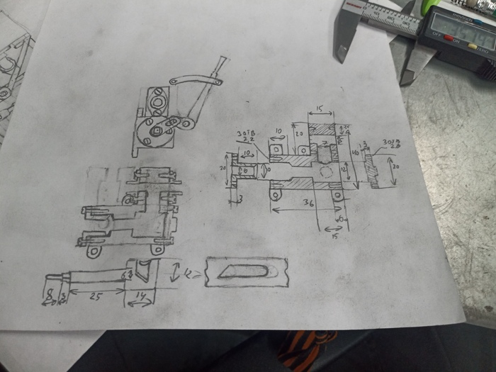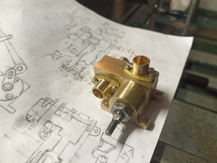 Далее самое сложное. Регулятор. Регулятором называют главный паровой клапан, чаще всего находящийся внутри сухопарника парового котла, который отвечает за регулировку количества пара, подаваемого к паровым машинам. На настоящих паровозах чаще применялись регуляторы несколько иной конструкции, но я выбрал для себя конструкцию с поворотным золотником и примерно набросал то, что мне нужно, а затем подогнал некоторые размеры, дабы вписаться в масштаб машины и приступил к изготовлению.