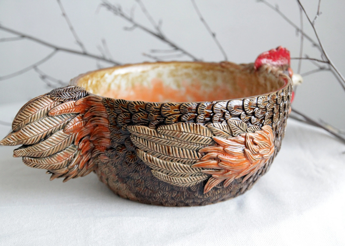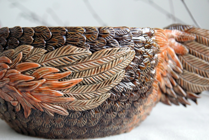 Сколько тут перьев, сказать страшно. И сама квошка получилась огромная, аж на два литра. Все перышки и пушинки вылеплены вручную, под звуки музыки, разговоров и сотни мыслей. Времени на работу уходит столько, что передумать успеваешь обо всем на свете)