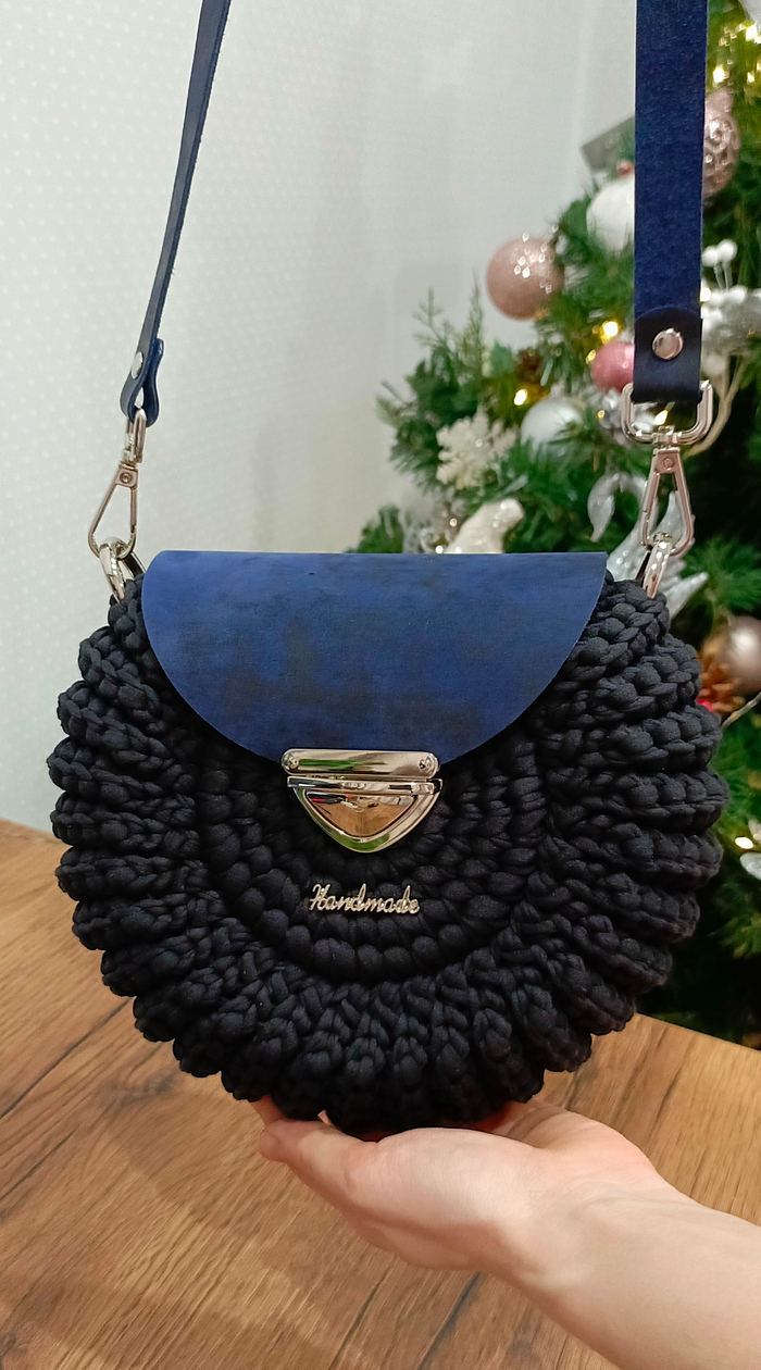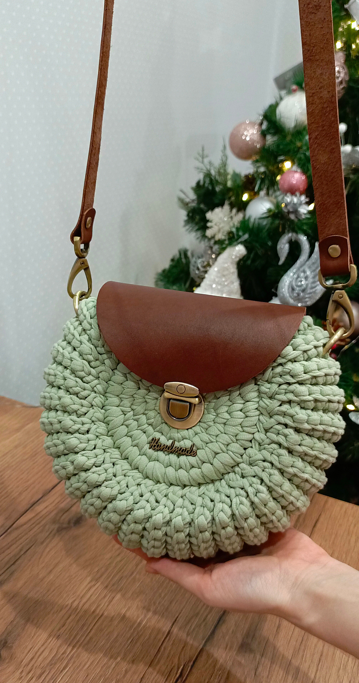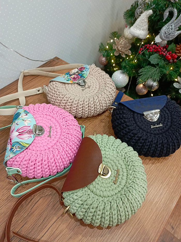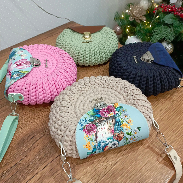 Сумочки связаны из трикотажной пряжи, подкладка канвас, а клапаны и ремешки выполнены из кожи или экокожи.