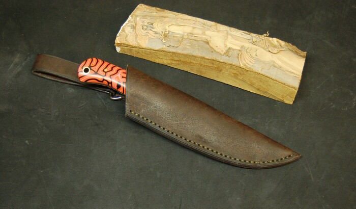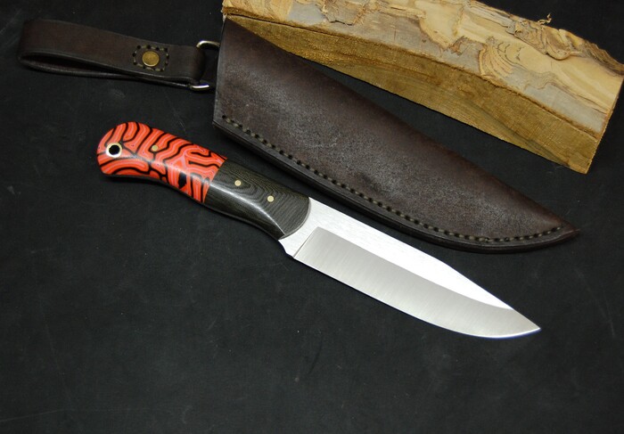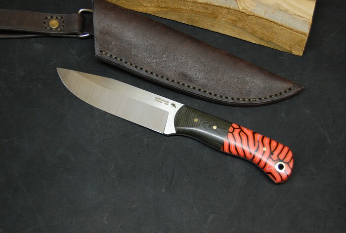 В этом ноже яркая оранжевая хаотичная микарта. Такой рисунок еще называется "мозговой". В лесу не потеряется и будет легко заметен. Хорошо подобрали ткань, яркий рисунок не блекнет при пропитке смолой и остается ярким и притным