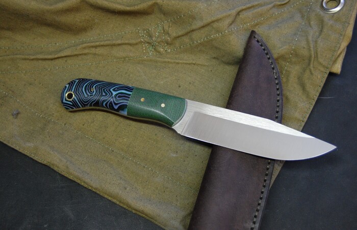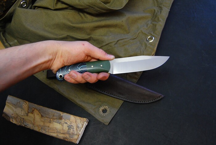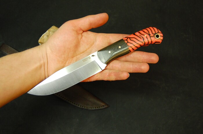 Решил попробовать такую форму клинка и рукояти. Клинок простой, прямой формы, со скосом на кончик. Рукоять небольшая, 110мм, но вполне подходит для комфортного удержания. Таким образом получается хороший уверенный нож с хорошим клинком, при этом не такой большой и громоздкий. Больше функционала при не таких больших габаритах. Есть тупье перед режущей кромкой, для выживальщиков почти идеально)