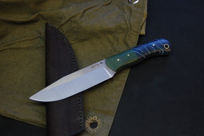 Сталь на ножах AUS10co, 3 мм толщиной. Шлифованная голомень клинка и рикассо в продольный сатин. Спуски прямые, высокие. Рукоять из микарты. Пины латунные 3 мм. Латунная трубка под темлячное отверстие 8 мм