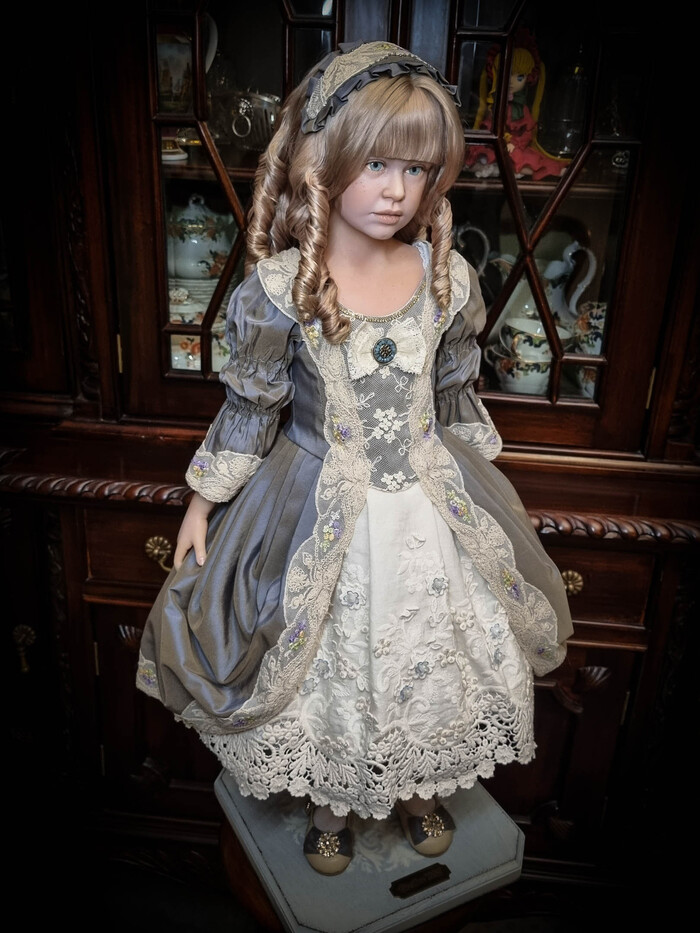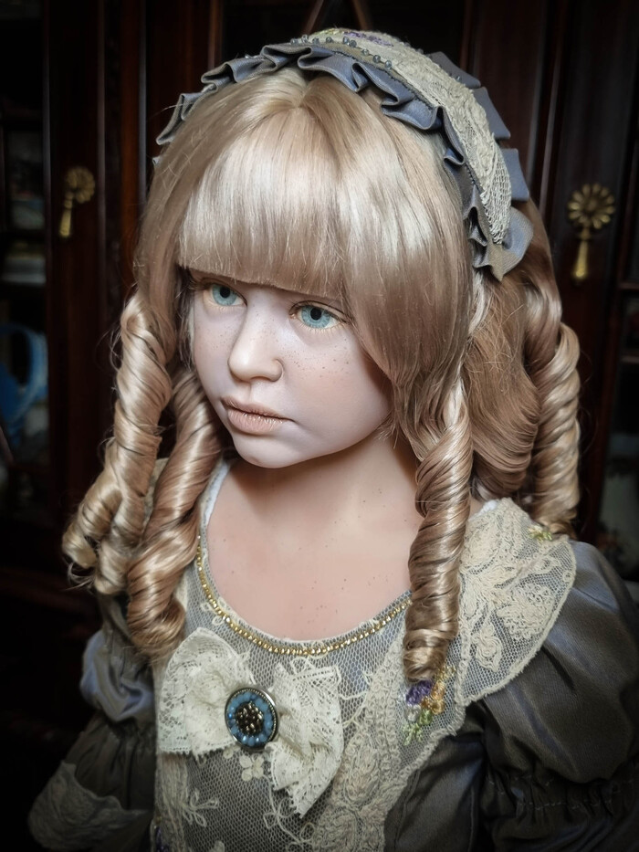 По техническим моментам, скульптурная часть цернит, Ла долл, девочка подвижная классическая, головка на шарнире тельце на металлическом каркасе скульптурно набивное, волосы техника частой поклейки, можно чесать как угодно и делать прически, почти как вживление, но есть один основной пробор. Такая техника отлично подходит для кукольных образов так как волос получается очень много, роскошная копна :) Платье натуральный 100% шелк(тафта-мой любимый вид), батист, вышивка хлопком 3д, антикварное кружево два вида, балетки натуральная кожа (создавались под заказ специально для Мии) декор мой, подставка бук. Рост 68 см. По времени создания, если без записи мастер класса, а просто создание спокойное такой работы заняло бы где-то месяц-полтора работы, а так ушло 9 месяцев где-то :) ну еще же заказы были, и брошки и барельефы.