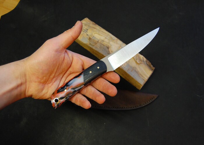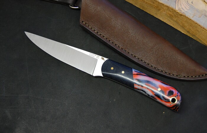 Нож изготовлен из нержавеющей стали AUS10co, 3 мм толщиной. Фултанг. Спуски прямые, высокие. Рикассо и голомень клинка в продольном сатине. Рукоять из микарты двух цветов, черной и цветной. Пины латунные 3 мм, отверстие под темляк из латунной трубочки 8 мм.