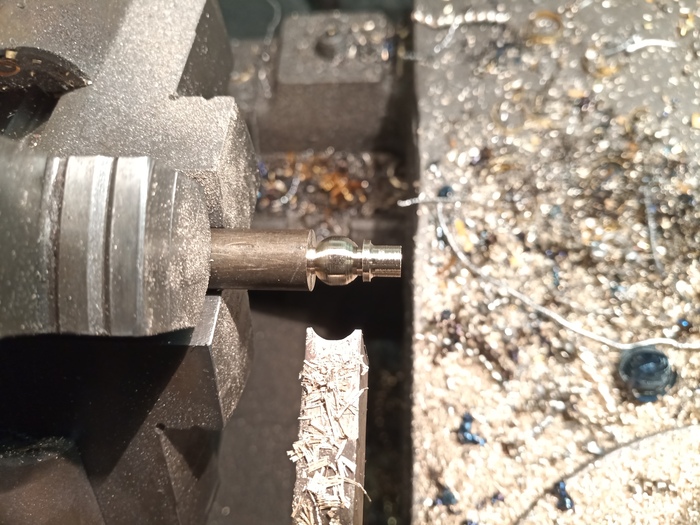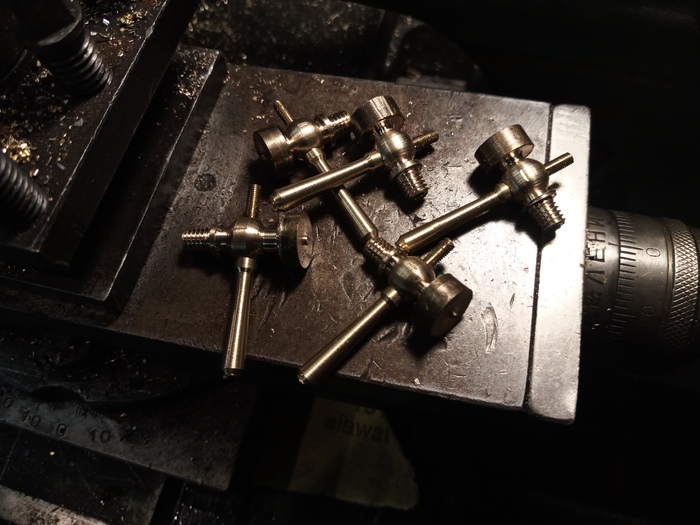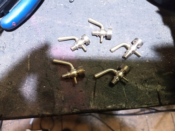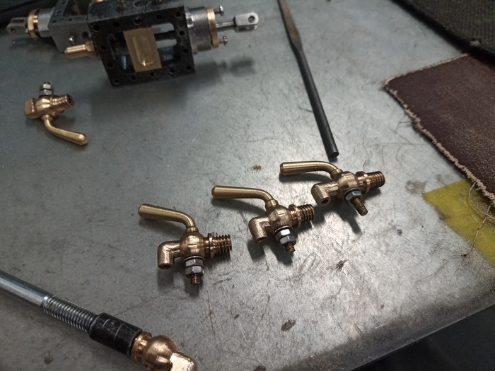 На моём двигателе, если я планирую запускать его на пару, без кранов тоже не обойтись. Сделал их я из латунного прутка с помощью фасонного резца, а отверстия под конические поворотные золотники с помощью развертки с конусностью 1:50. Носы кранов были начерно выфрезерованы, а затем просверлены и доработаны напильником до достижения красоты. В итоге получилось пять кранов: по два на цилиндры и один на конденсационную маслёнку, которую я тоже планирую сделать. Что б вы понимали размер, длина всего крана вместе с резьбой м6 всего 25мм, а диаметр шарообразной части крана- 10мм.