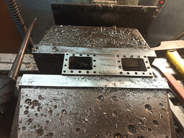 Сейчас речь пойдет про парораспределители. Они на данном двигателе золотникового типа. Начнем с корпусов. Сделал их из той же многострадальной стальной пластины 16мм, обрезав ушм и оболванив уже на фрезере. Разметил и насверлил отверстия, профрезеровал окна, а после этого разделил детали. Затем придал им чуть более похожую на чертеж форму уже в токарном станке. Ну и изготовил фланцы поджима набивок штоков парораспределителей. Штоки сделал из стали 40х.
