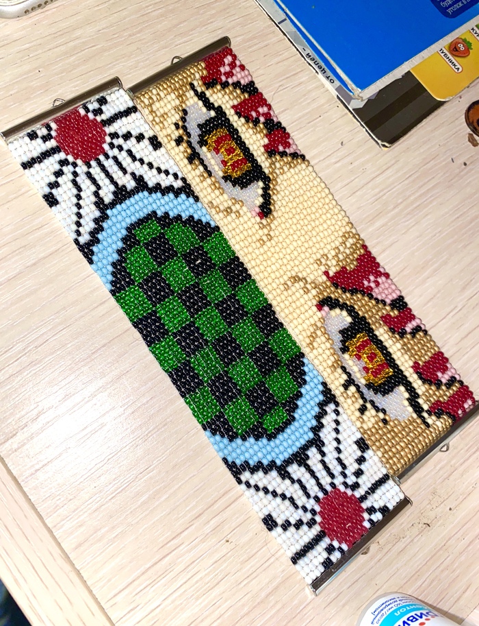 Первый браслет, конечно, всратый получился :) Второй получше. А потом я купила нормальный бисер, станок и, главное, нитки (годные нитки влияют на качество больше, чем что бы то ни было, отвечаю).