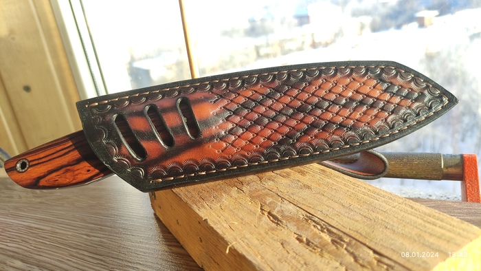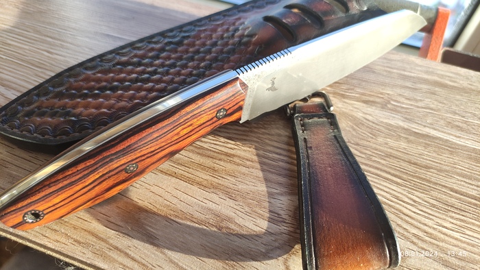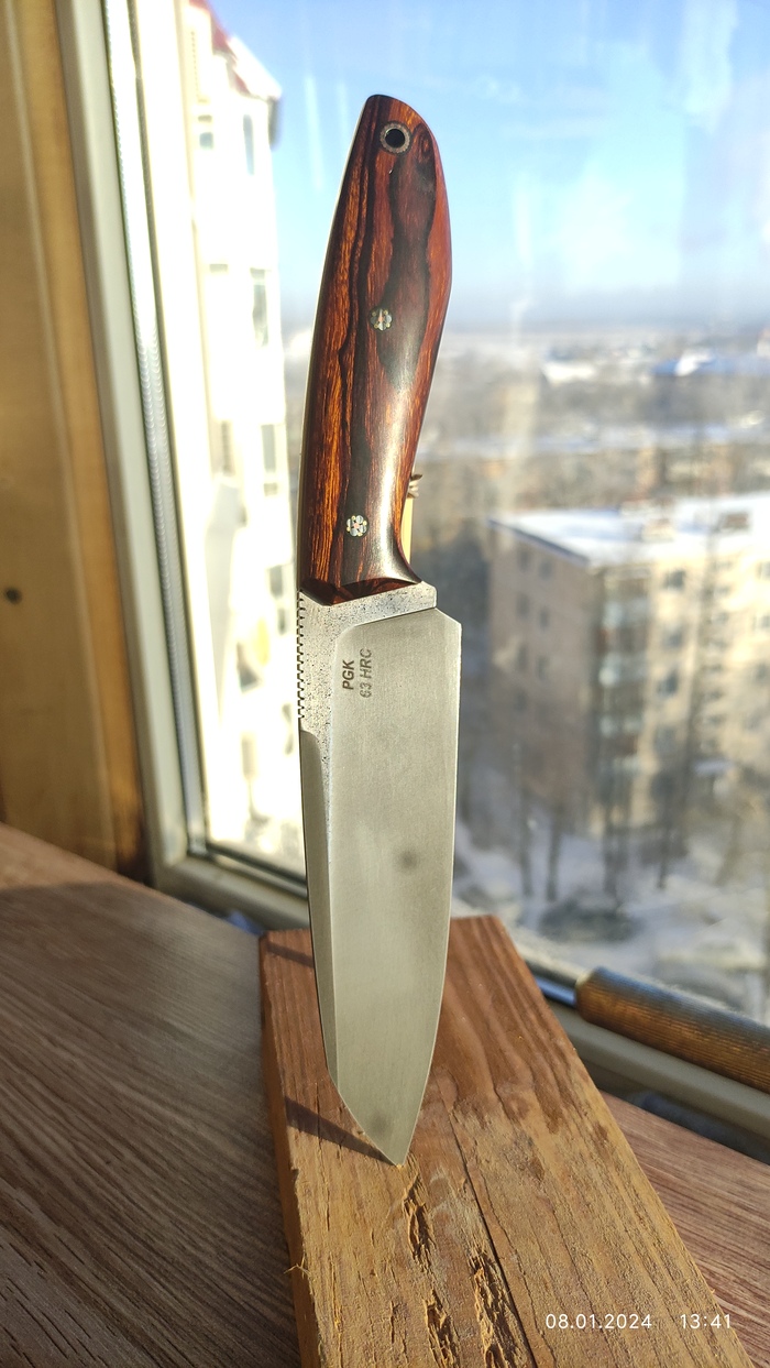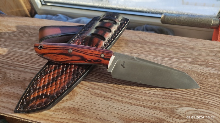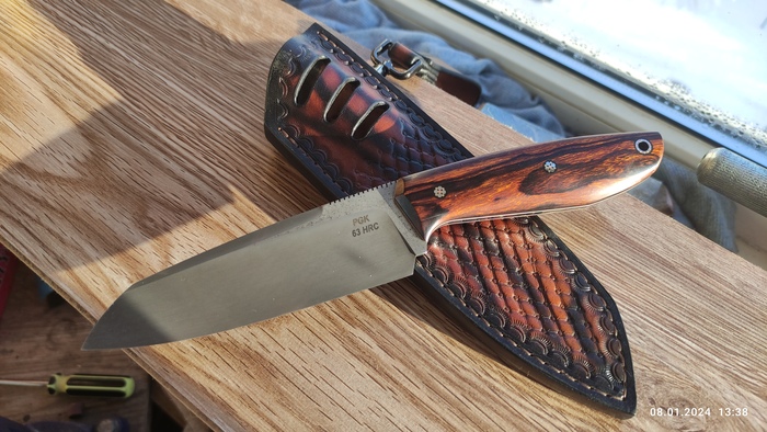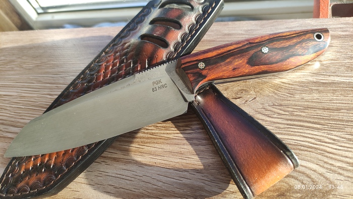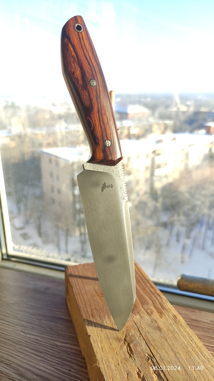 В том году нарисовал, а на праздниках воплотил в жизнь такой нож, фултанг. Рукоять с выборками для облегчения. ПЖК на 63 ед, клинок 130х39х3,6 мм, спуски прямые, сведен в 0,3-0,4, травление в ортофосфорной кислоте. Рукоять 118 мм, айронвуд, G10, пины. Ножны растишка 4 мм, подвес отстегивается, т.к. людям носящим ножны за фиксированный подвес, петля мешает.