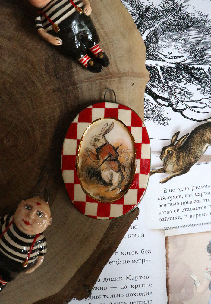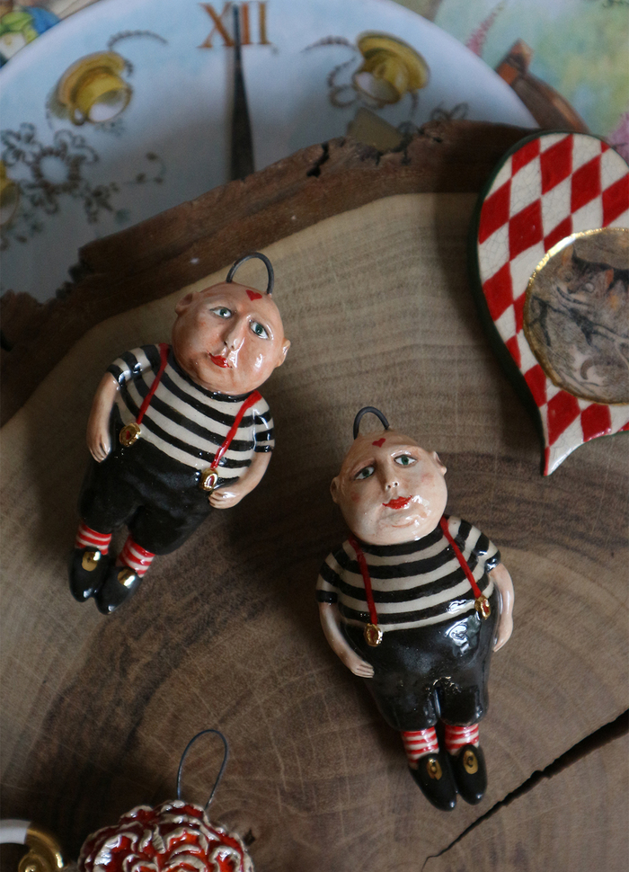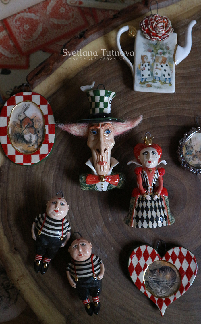 Привет! Я Света и я художник-керамист. Одно из моих любимых направлений - это ёлочные игрушки. К этому Рождеству мне хотелось сделать что-то особенное и я обратилась к Льюису Кэрроллу и его "Алисе в стране чудес". С радостью делюсь результатом с вами:) Безумный шляпник, Траляля и Труляля, белый кролик, Королева, чеширский кот и Алиса - все герои собраны в одной коллекции. Работа была в новинку ещё и в том смысле, что это, пожалуй, самые трудоёмкие и подробные игрушки из всех, что я делала.
