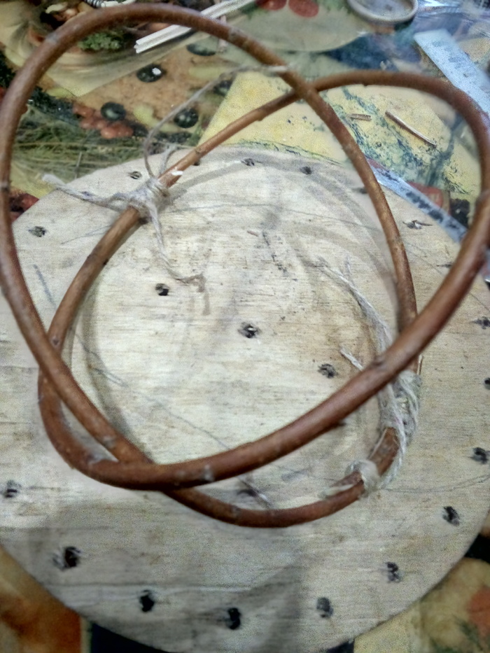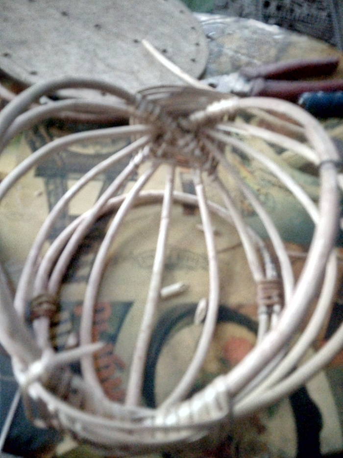 Проплетаю нижний обруч, что-то типа узелковым плетением. Времянки срезаю по ходу.