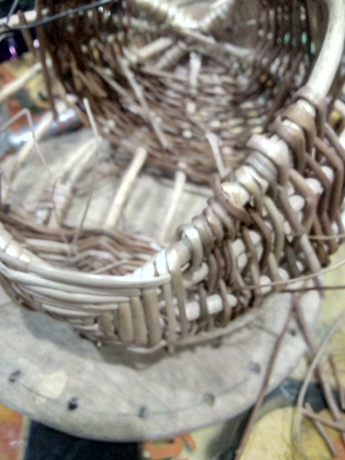 Далее как плели в кошике. Отличия: розетка выполнена большим размером,( угол между обручами не прямой), дополнительные рёбра не промял по плоскости ( оставил полукругом). Снизу на плоскости подплёл ещё один обруч, для большей устойчивости. Можно замотать ниткой, но я сделал сразу прутиком.