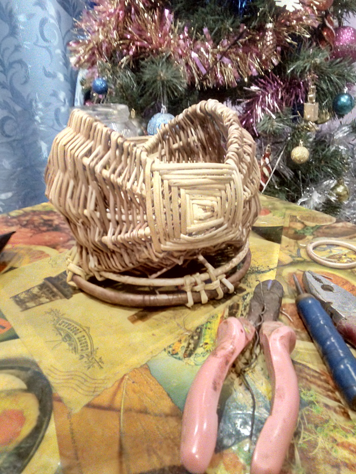Быстренько набираем плетение, с двух сторон, также как с кошиком. Только дополнительно захватываем нижний обруч.