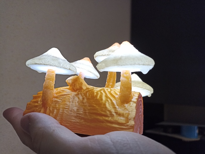 Брёвнышко рисовал в Блендере. Первым делом отделение под оборудование, на него сверху натягивается пол-цилиндра, помятые скульптурными инструментами. Затем заполнение промежутков, прорезание отверстий и интеграция грибных ножек. Ну и в печать.