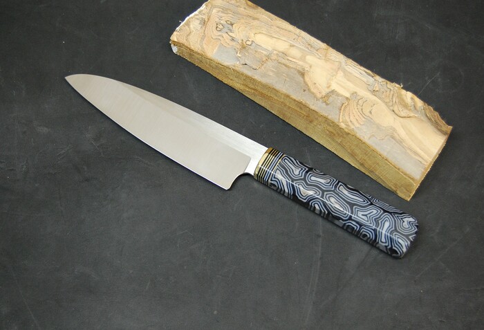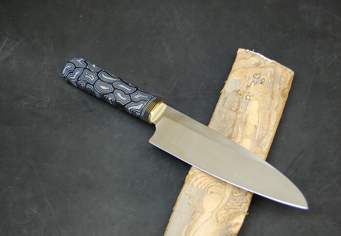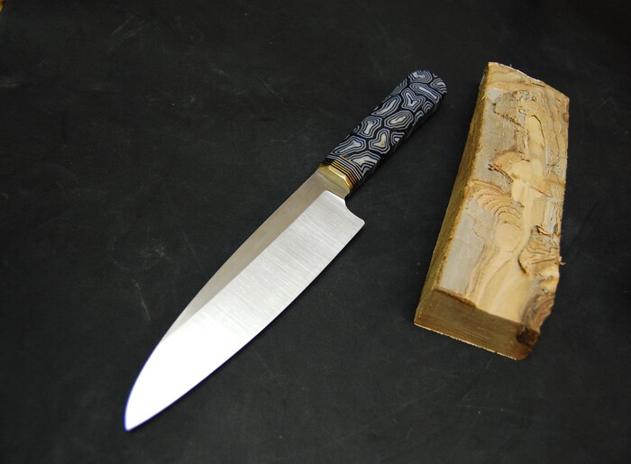Кухонный нож по японским мотивам. Сталь нержавеющая N690, 2 мм толщиной. Рукоять из микарты и латуни. Больстер так же из латуни с посадкой под клинок. Форма рукояти восьмигранная, с шлифованными гранями, что бы острыми не были.