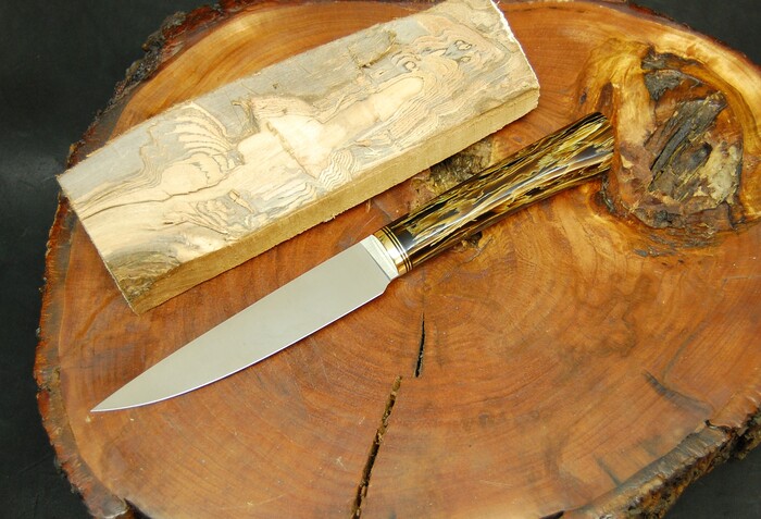 И третий нож, что успел собрать. Универсал для кухни, но с небольшим закосом на что то походное. Сталь здесь N690, 2 мм толщиной. Спуски от обуха. Больстер из латуни так же с посадкой под клинок. Рукоять из гибрида акрила и листьев кукурузы. Монтаж так же сквозной на гайку.