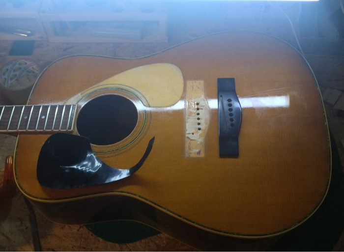 Попала она ко мне с довольно распространенной для азиатских гитар проблемой: блёклые пятна на лаке. И хотя чисто физически это ни на что не влияло, но очень раздражало визуально моего заказчика. Он ни в какую не пожелал с этим мириться, и обратился ко мне с пожеланием о замене покрытия. Вот как это выглядело: