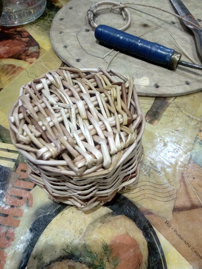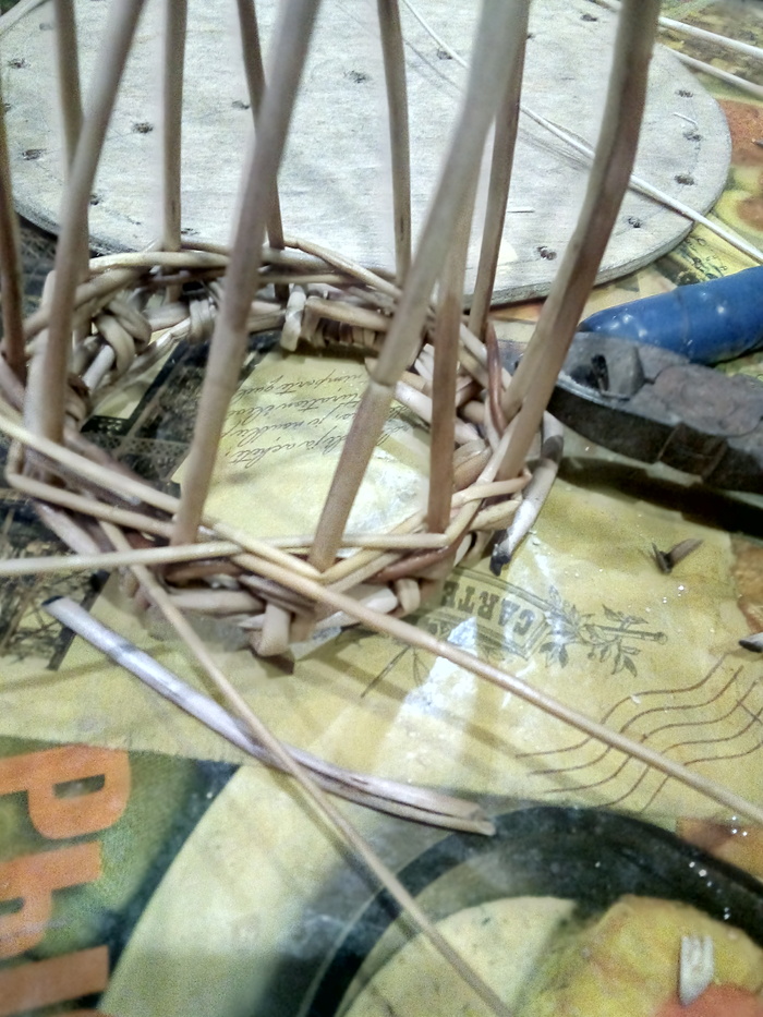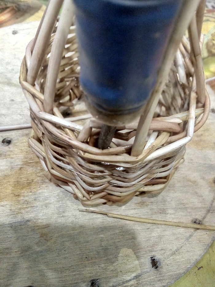 Каждую стойку подрезаем, вставляем рядом с противоположной в плетение, в данном случае на 15–20 мм.. Помогаем шилом. Должно получиться вот так