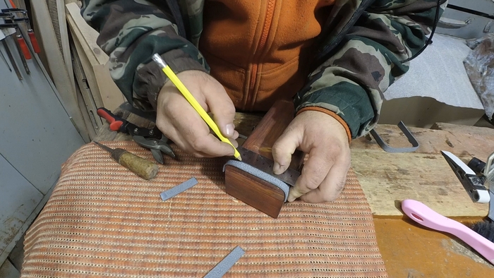 Сперва из трубы сделал лист при помощи строительного фена, а затем вырезал из него полоски. Гравером при помощи борфрезы нанес на полоски имитацию ковки.