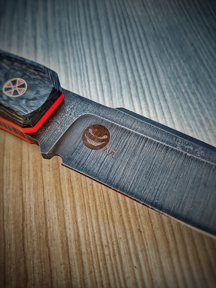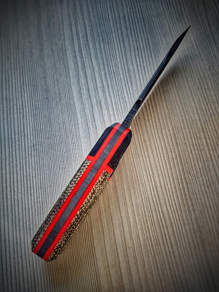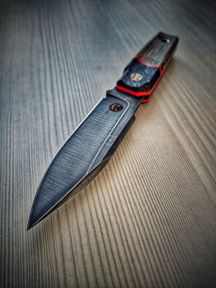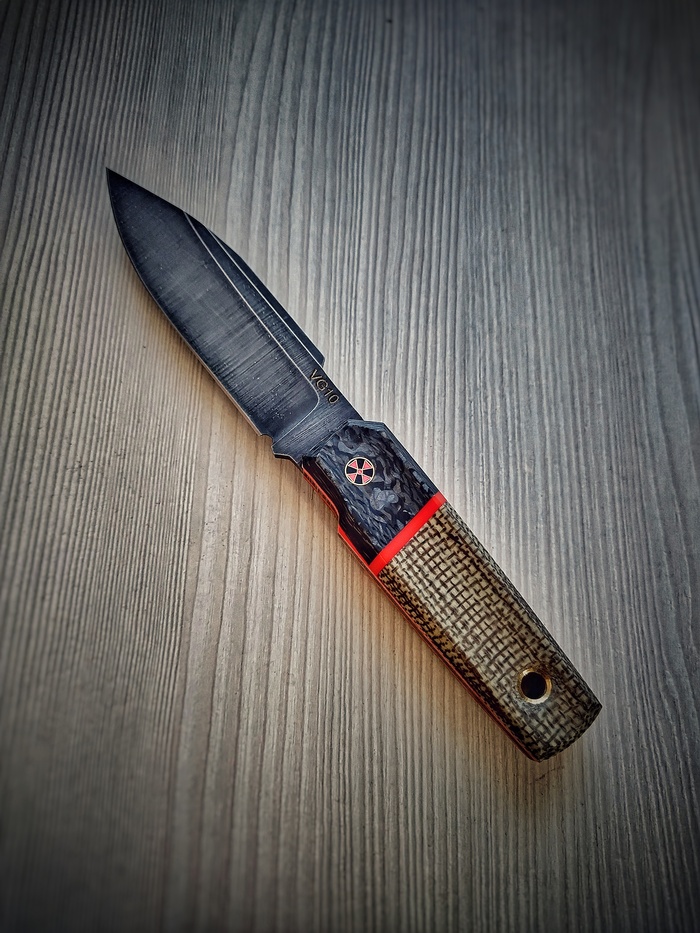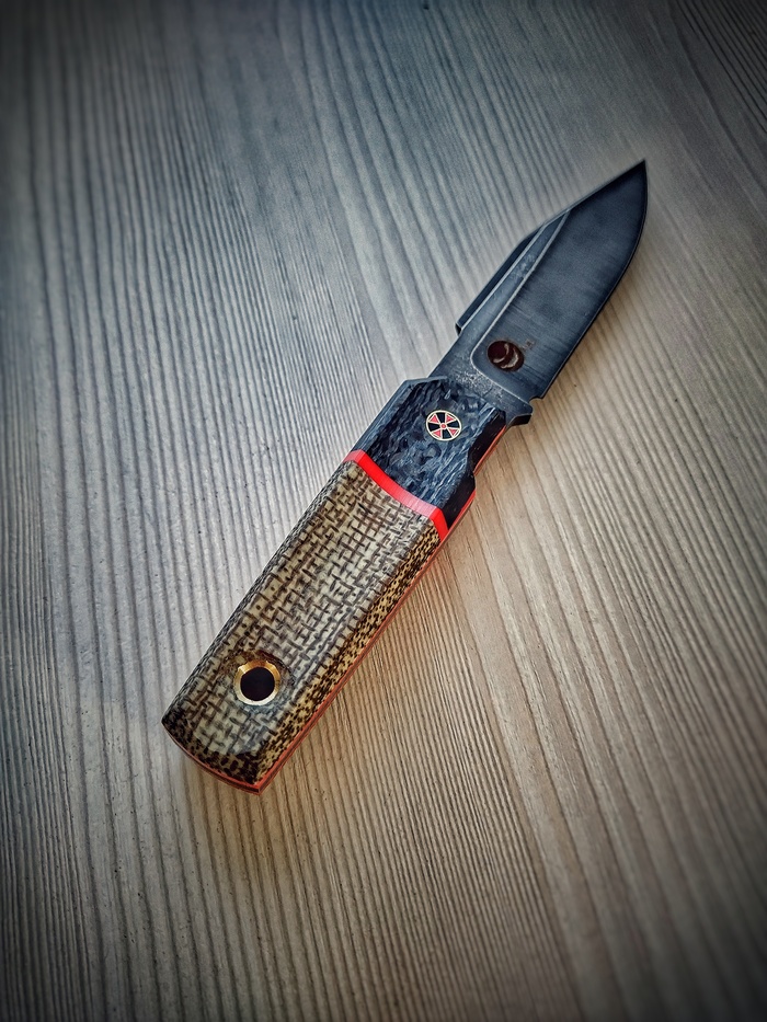 Приветы. Недавно получился такой вот ножичек, в стилистике шотландского скин-ду, техноверсия. В материалах джутовая микарта, карбон, акрил, сталь VG10. Нож небольшой, габариты 220х30, клин 120мм, спуски вогнутые, протравлен.