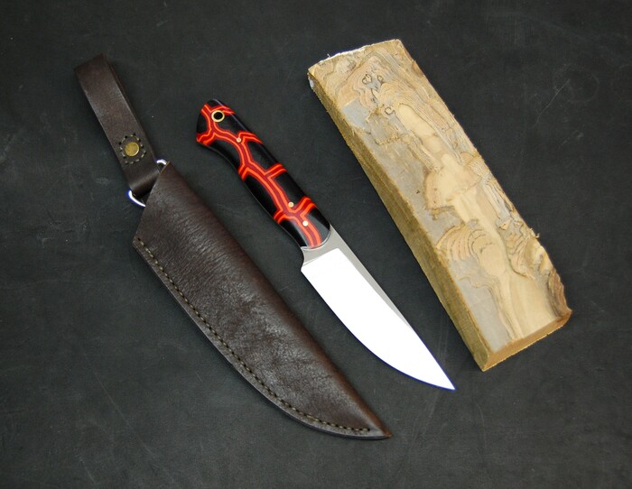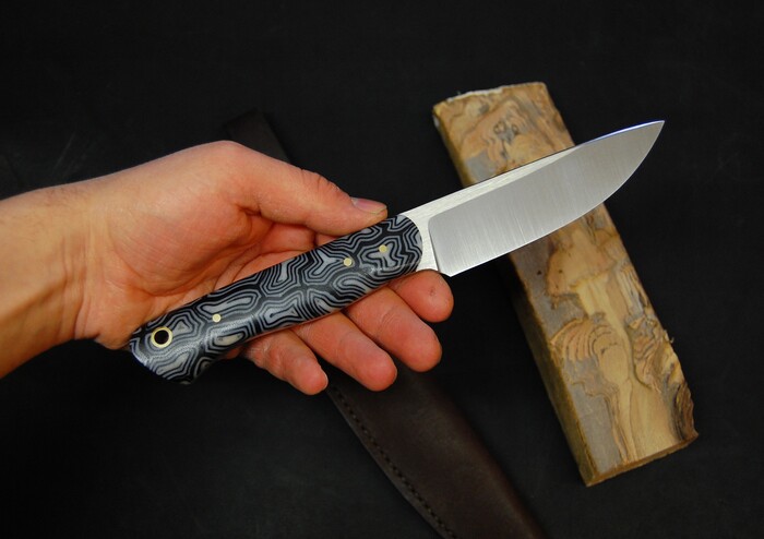 Считаю эти ножи максимальными универсалами. Форма рукояти ближе к кухонной, только слегка расширенная и удлиненная. 120 мм, хватит и для удержания в зимних перчатках. Форма клинка тоже простая, подойдет для любых задач. Высокие спуски для хорошего реза. При толщине 3 мм получается хороший запас прочности. Открытая рк, без выраженного упора для пальца для полноценной работы по продуктам. Микарта не боится повреждений и полностью нейтральна к воде. Главное не нагревать свыше 50 градусов и не мыть в посудомойке