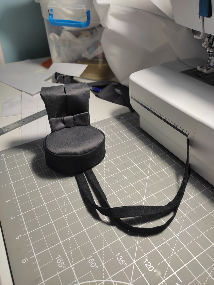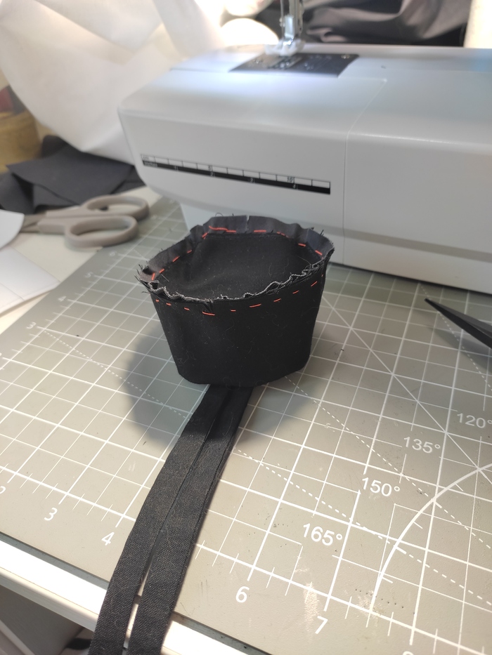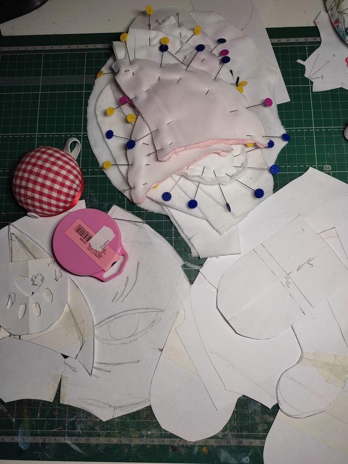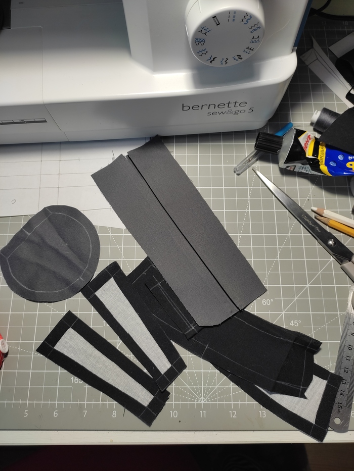 Применила все свои околонулевые инженерные знания, построила выкройку, раскроила, продублировала детали, чтобы шапочка держала форму. Где-то насыпала отсебятины, конечно, но к исторической достоверности и не стремились. В общей сложности, на шапочку ушло часа 3.