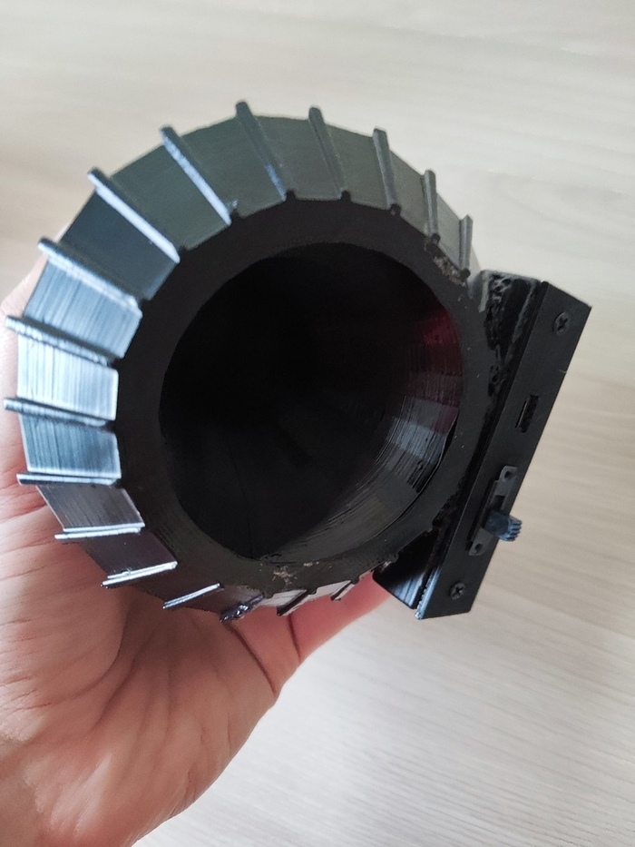 Не хотелось тянуть никаких проводов, поэтому питание аккумуляторное, с возможностью подзарядки от обычного телефонного блока питания. Немного видоизменил изначальную 3д модель: добавил отсек под аккумулятор, с отверстиями под переключатель и юсб зарядку.