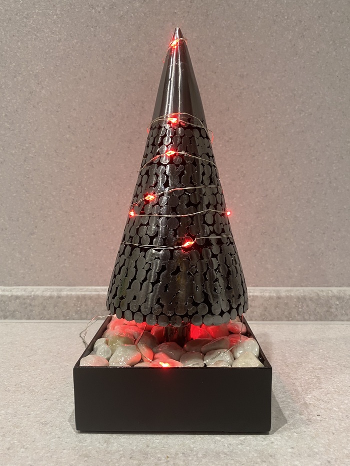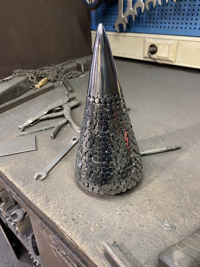 Пруток 6мм. Нарезаны по 4см. Прям много. Потом всё это долго сваривается и нудно обтачивается. Диаметр 9 см. Первоначальна начинал делать больше. Но на этапе четвёртого ряда понял что тупо не хватит железок. Так что решил сделать мини ёлку.