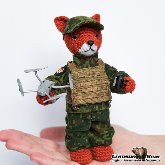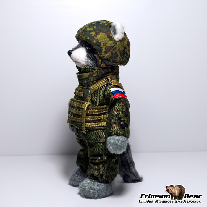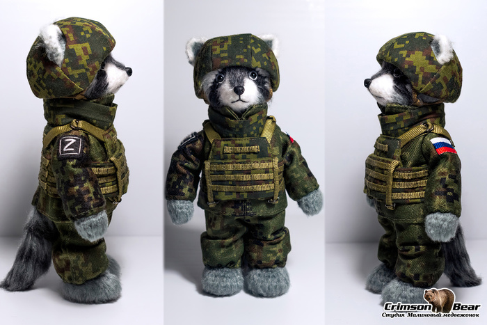 Размер енота 14,5 см. Подвижная голова на шплинтовом креплении, лапы и хвост на меднопроволочном каркасе. Очень пушистый. Камуфляжный бронежилет с воротом. Каска из композита, сверху камуфляжный чехол. Нашивки флаг РФ и Z.