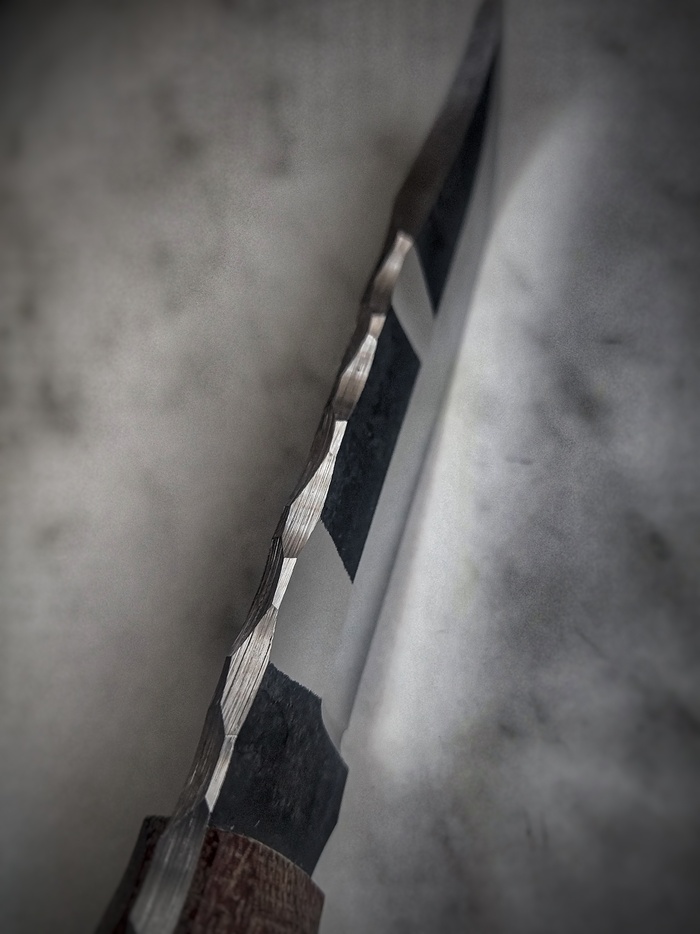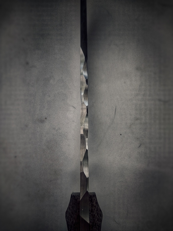 исходные данные: сталь 95х18, клинок 130х25х4мм, спуски сканди, 12мм высоты, чуть подлинзованы, ≈22°, проточки ≈0,3мм глубиной, по сути убрана только окалина.
