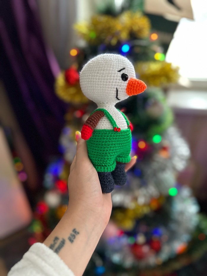 Вчера я связала снеговика, и я очень рада, что с него можно снять все. Но больше всего меня восхищает его шляпка. Создание этой веселой фигуры было довольно простым, но заняло много времени из-за мелких деталей. Я люблю подобные игрушки, особенно потому, что они не выглядят скучно. Снеговик мило украшает мой компьютерный стол, и когда я смотрю на него, вспоминаю, что уже скоро наступит новый год.