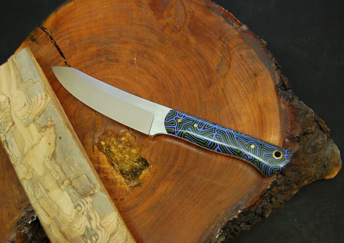 Нож изготовлен из нержавеющей стали AUS10co, 3 мм толщиной. Спуски прямые, высокие. Нож получился с сочетанием походного и кухни. Кончик немного вздернут вверх по типу скинера. Возможно не хватает небольшого фальшлезвия, что бы уменьшить толщину на месте сгиба, но это можно сделать и на готовом ноже, отслесарив на руках. Рукоять из мозговой микарты собственного изготовления. Мозговая, потому что рисунком похожа на мозг. А микарта это ткань, пропитанная эпоксидной смолой. Пины латунные 3 мм, темлячное отверстие из латунной трубки 8 мм