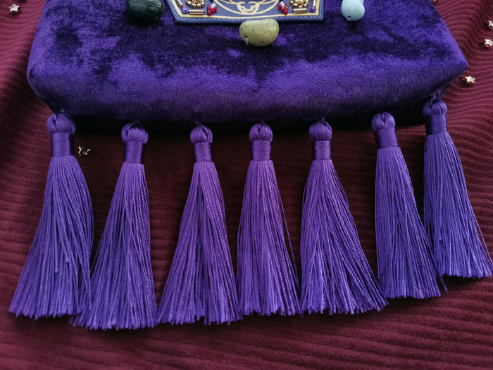 Сама сумка сшита из фиолетового бархата. Получилась плотной и держит форму. Размер сумки 20х20 см, объем 5-6 см.