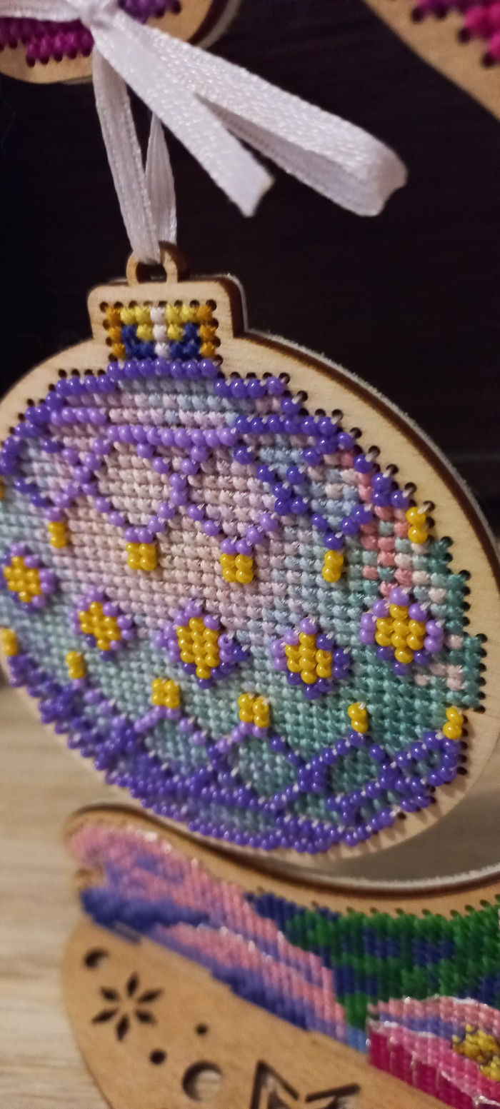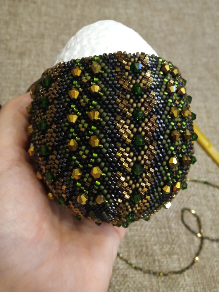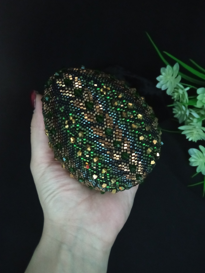Яйцо связано крючком. Чтобы получился рисунок, сначала бисер по схеме надо набрать (всего каких-то 7000 бисерин, целый день на это убила, хоть и на три части набор делила, всё равно муторно - самая сложная и нелюбимая часть).