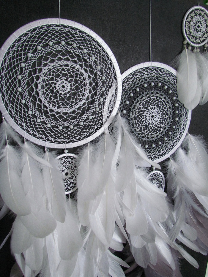 Так вот, собственно, о ловцах. Большие ловцы по сути одинаковые, но изделие с серыми перьями смотрится интереснее чем счёт своего красивого градиента перьев. Зато белоснежный ловец впишется в абсолютно любой интерьер)