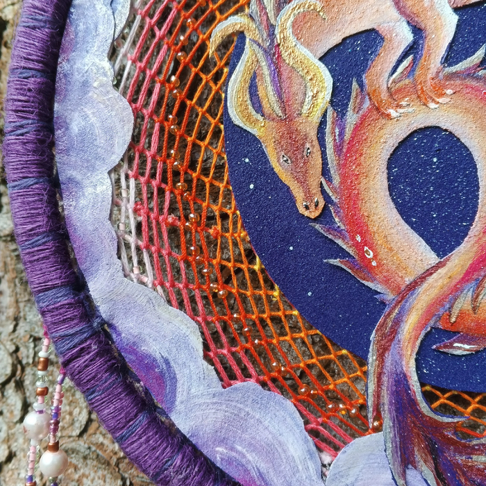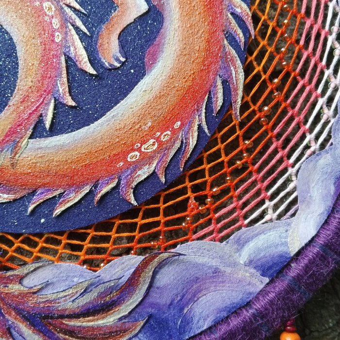 Вот такой дракон получился. Полностью ручная работа. Сам дракон вручную нарисован и перенесен на ткань. Обмотка у обода джутовая, плетение из хлопка. Облака - тоже кстати роспись по ткани.